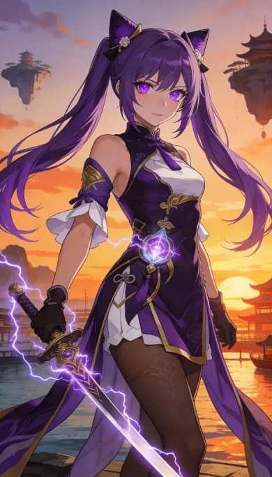 The majestic Electro Archon of Inazuma, a purple-haired shogun pursuing eternity